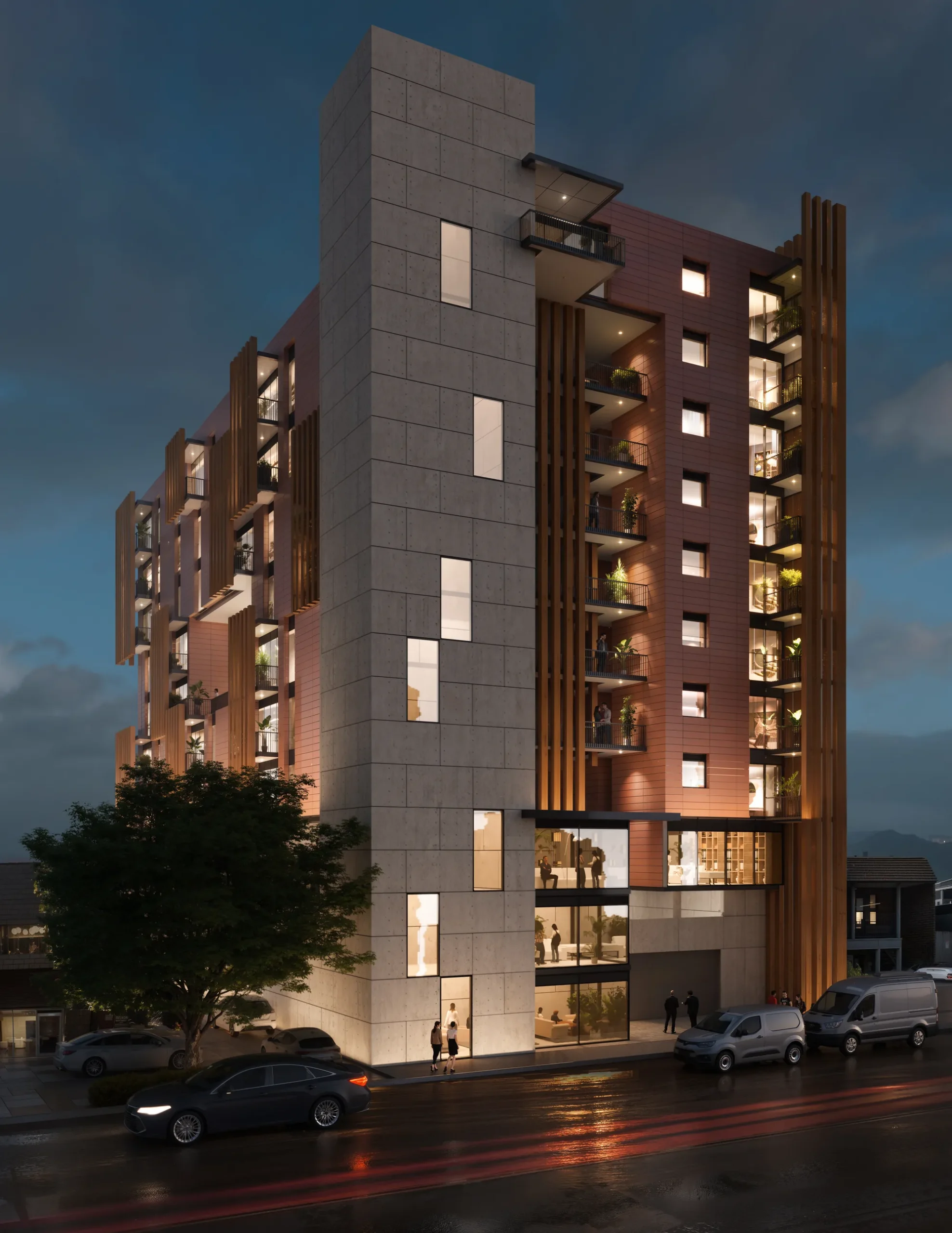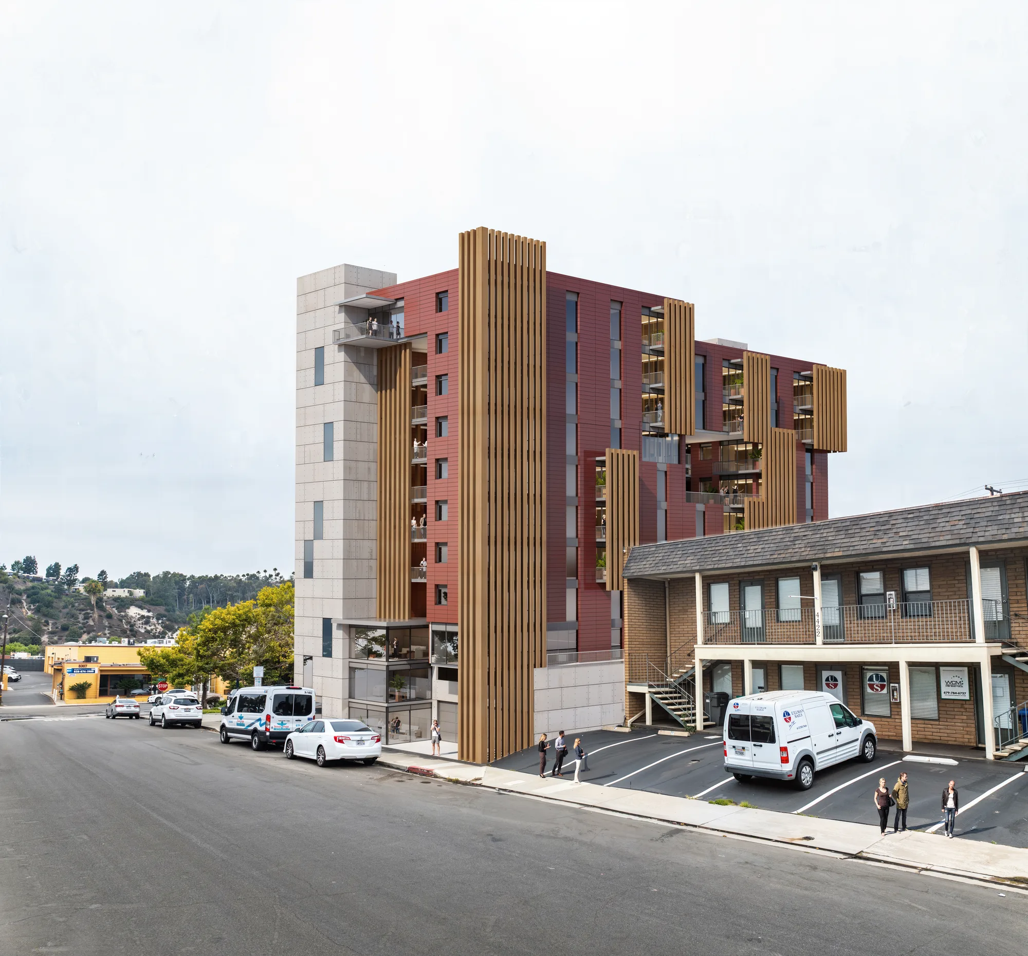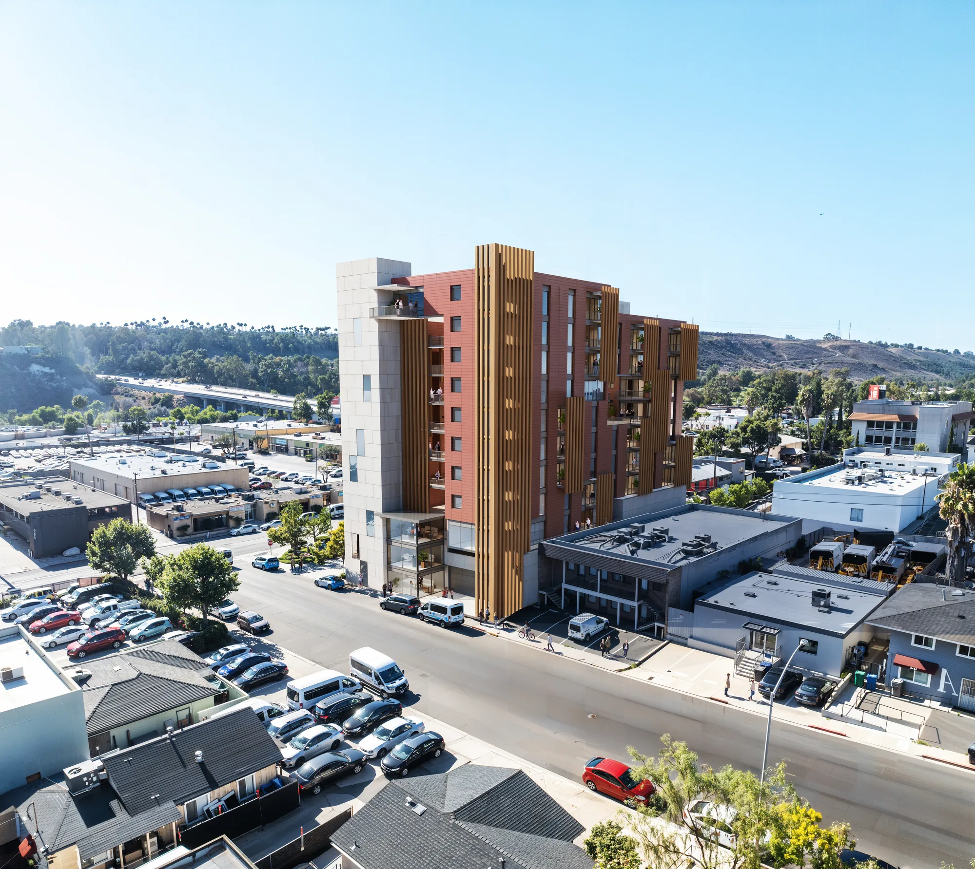 Towers on Glacier is a mid-rise, mixed-use development located in the Grantville area that plays on mass, density, and dynamism. The parcel area for this project is 10,500 square feet with the CC-3-6 zoning designation. This project falls within the “Complete Community Housing Solutions” overlay zone, which allows an additional F.A.R. of 4.0.